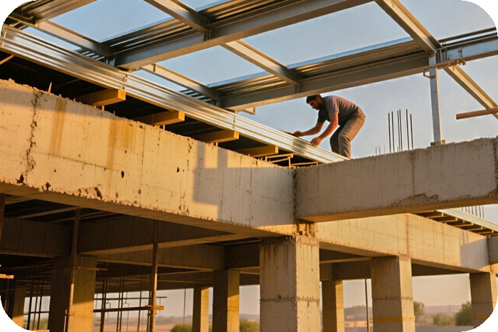 ابتدا تیرهای فولادی نصب می شوند. این تیرها باید با دقت تراز شده و به ستون ها جوش داده شوند. کنترل افقی بودن تیرها بسیار مهم است.
